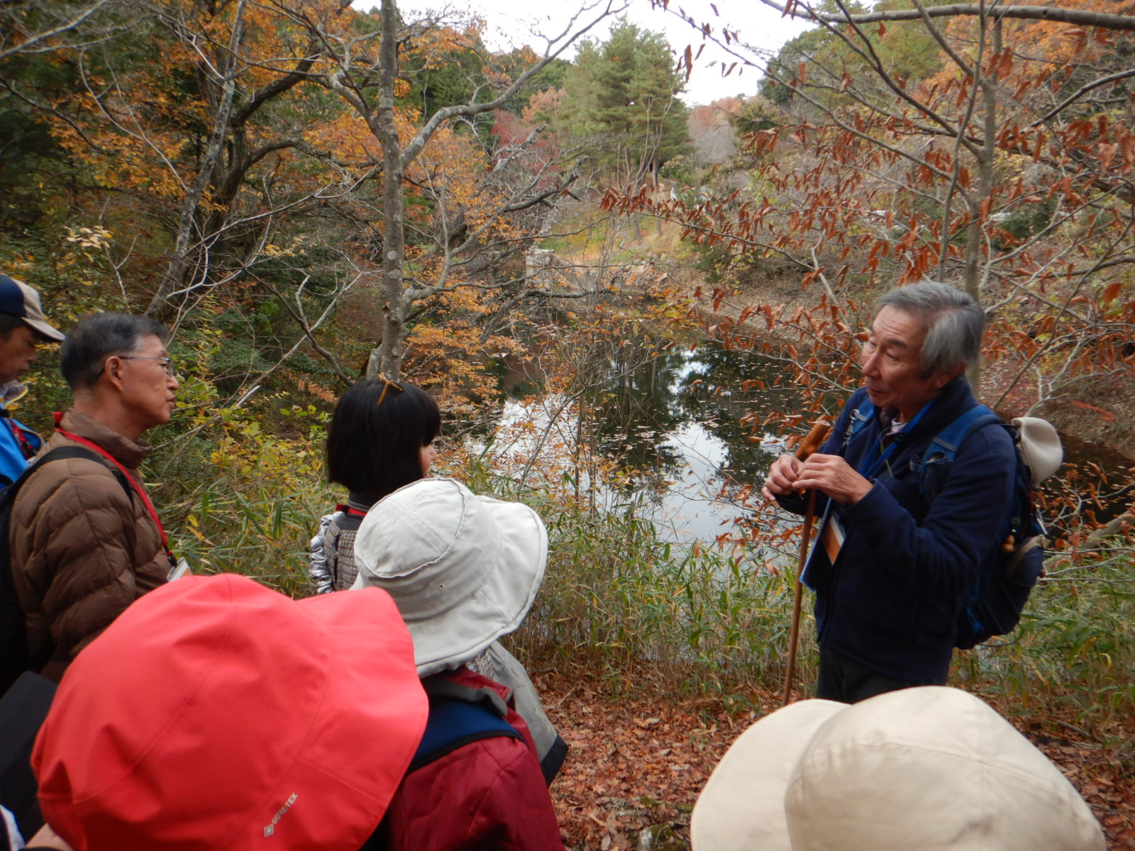 カツラの森で当時の工事や防災の意義などについてガイドからの説明を受ける参加者