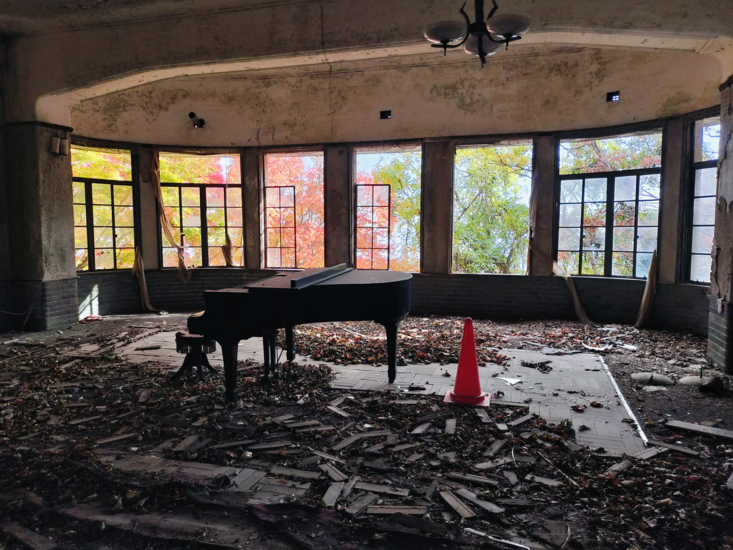 「廃墟の女王」とも称される旧摩耶観光ホテルは、アールデコ風のモダニズム建築として国の有形文化財に登録されています。しかし、その足元には、昭和13年阪神大水害からの復旧工事による治山施設が今も残り、建築物を支えながら都市への災害拡大を防ぎ続け、やがて自然へと還ろうとしています。