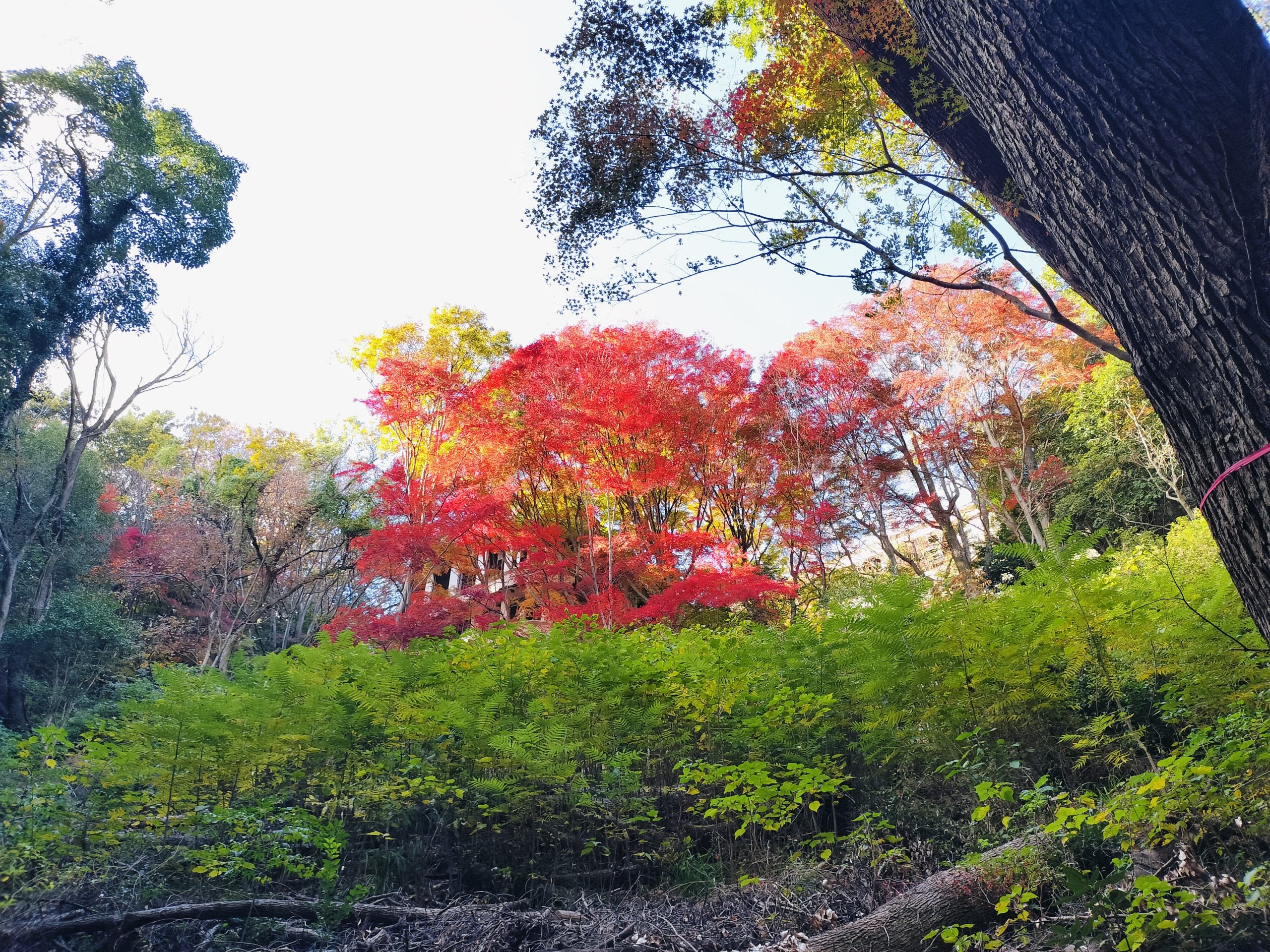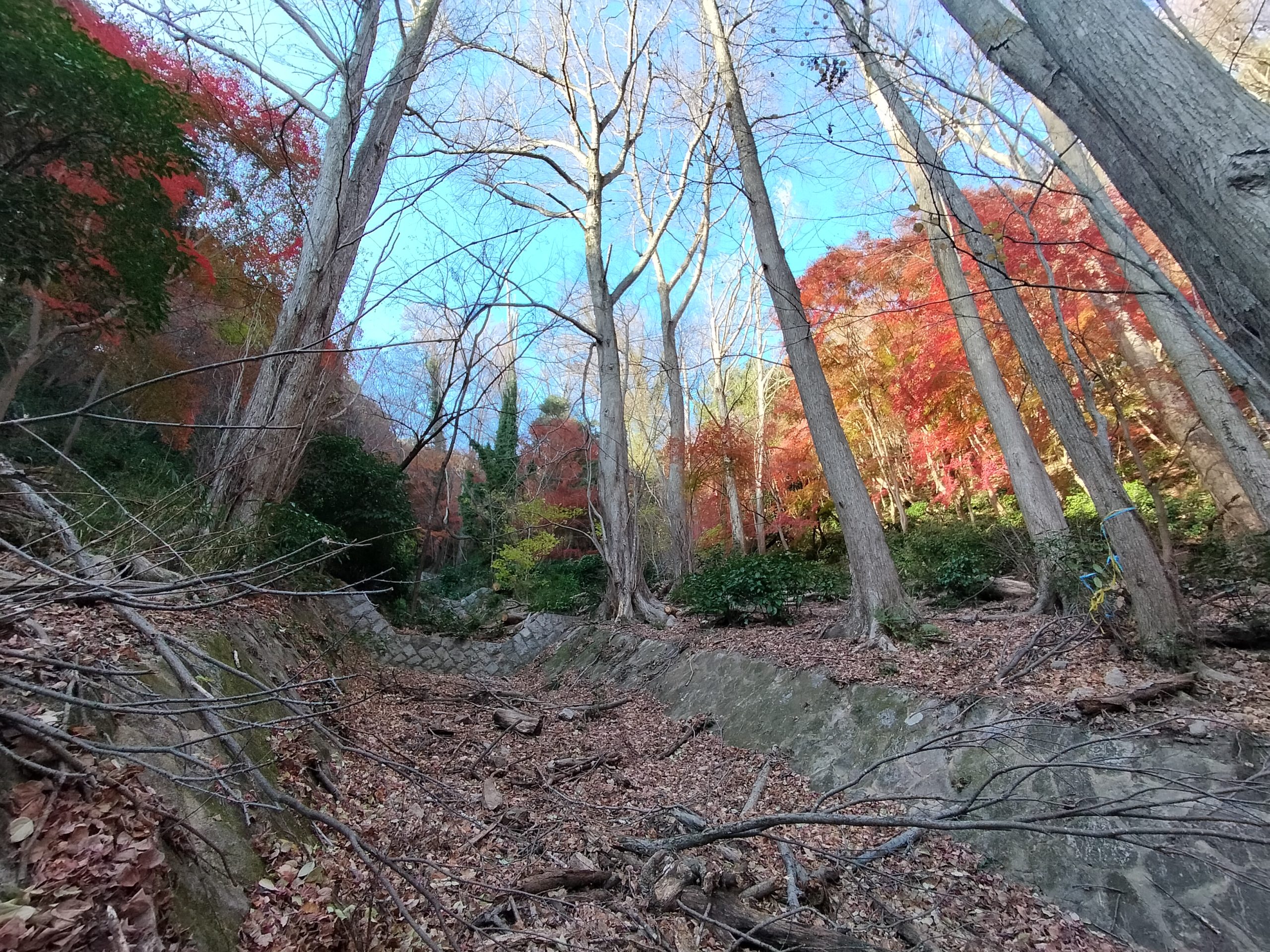 紅葉がピークになったマヤカン下のイロハモミジ林と治山遺構