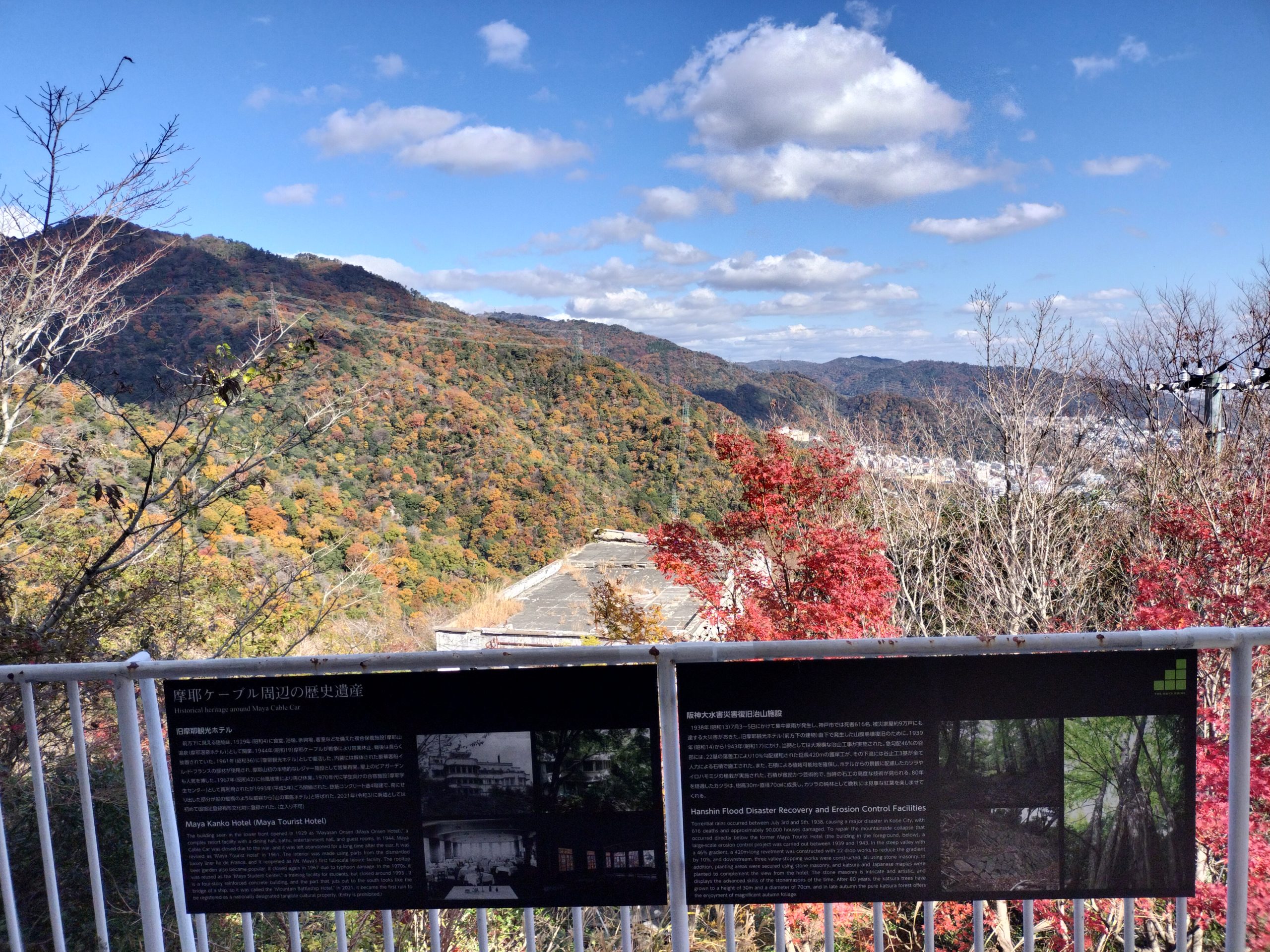 摩耶ケーブル虹の駅に設置している摩耶観光ホテルと治山遺構の説明板。