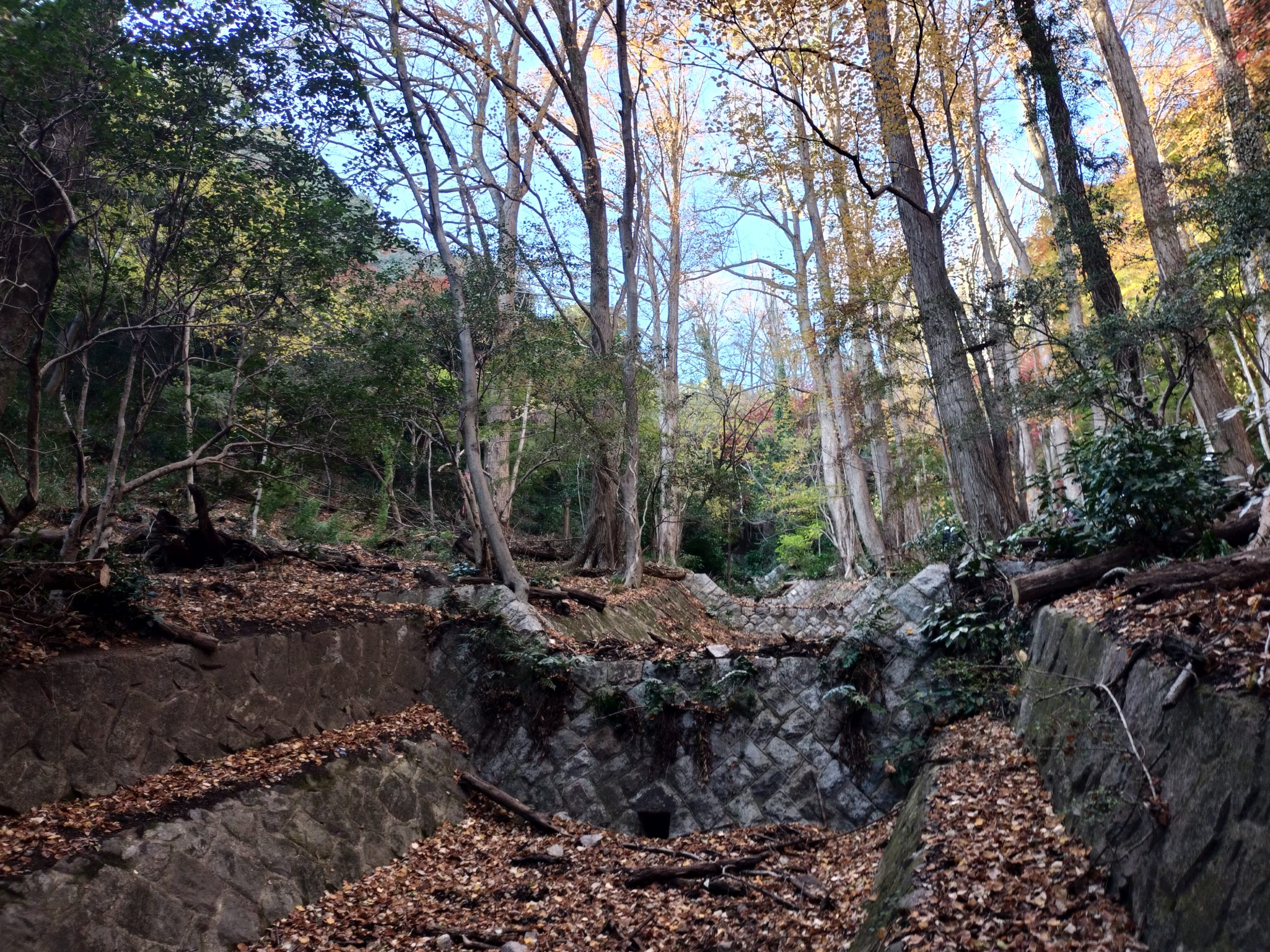 昭和14年から17年にかけて行われた復旧工事では、石を整形し組み合わせて谷止や護岸を強化する「空石積」や、景観に配慮したカツラやイロハモミジの植樹など、熟練工の技術が駆使されました。現在ではその多くが自然の森へと変化し、当時の技術を目にする機会は限られています。