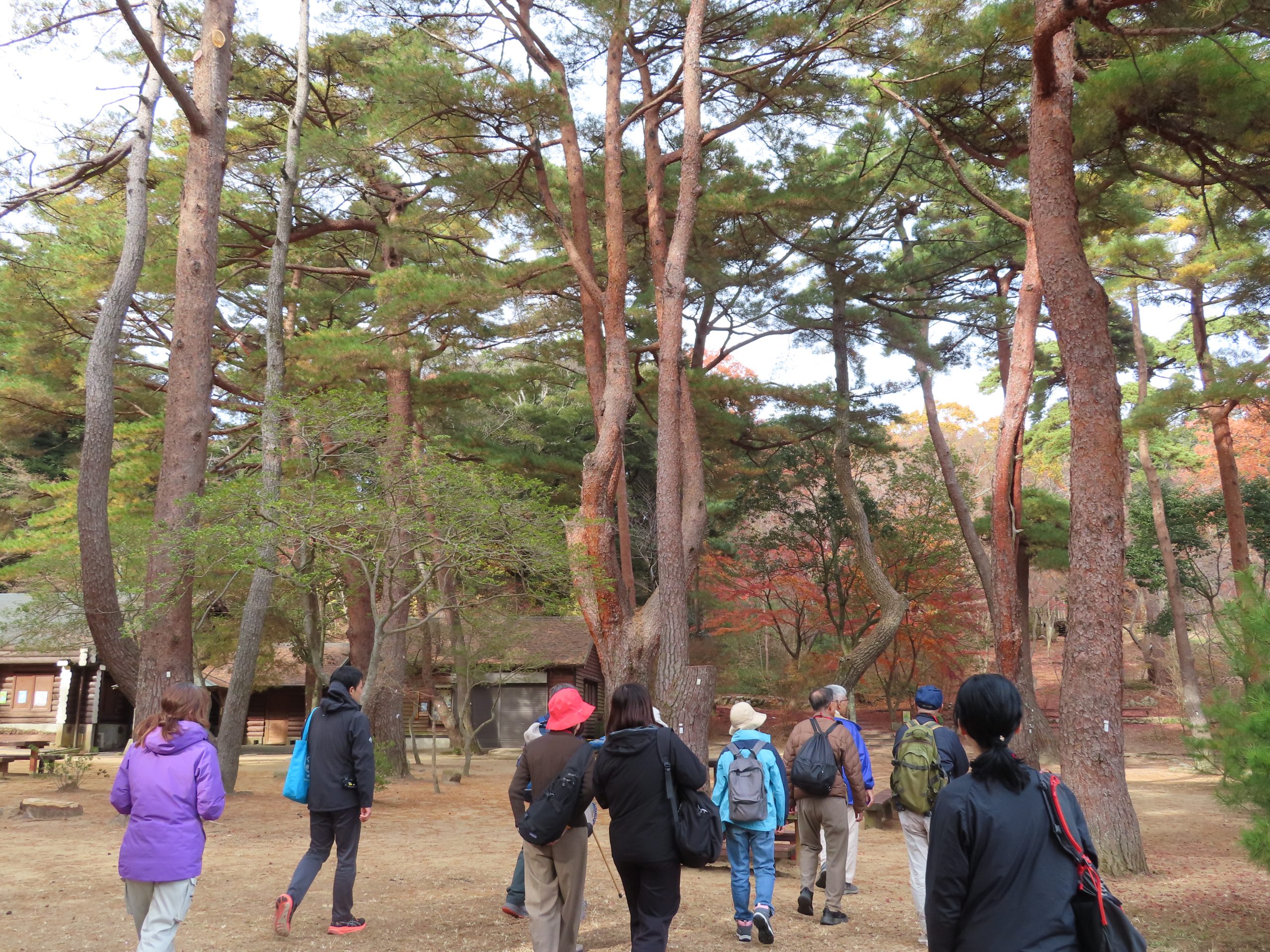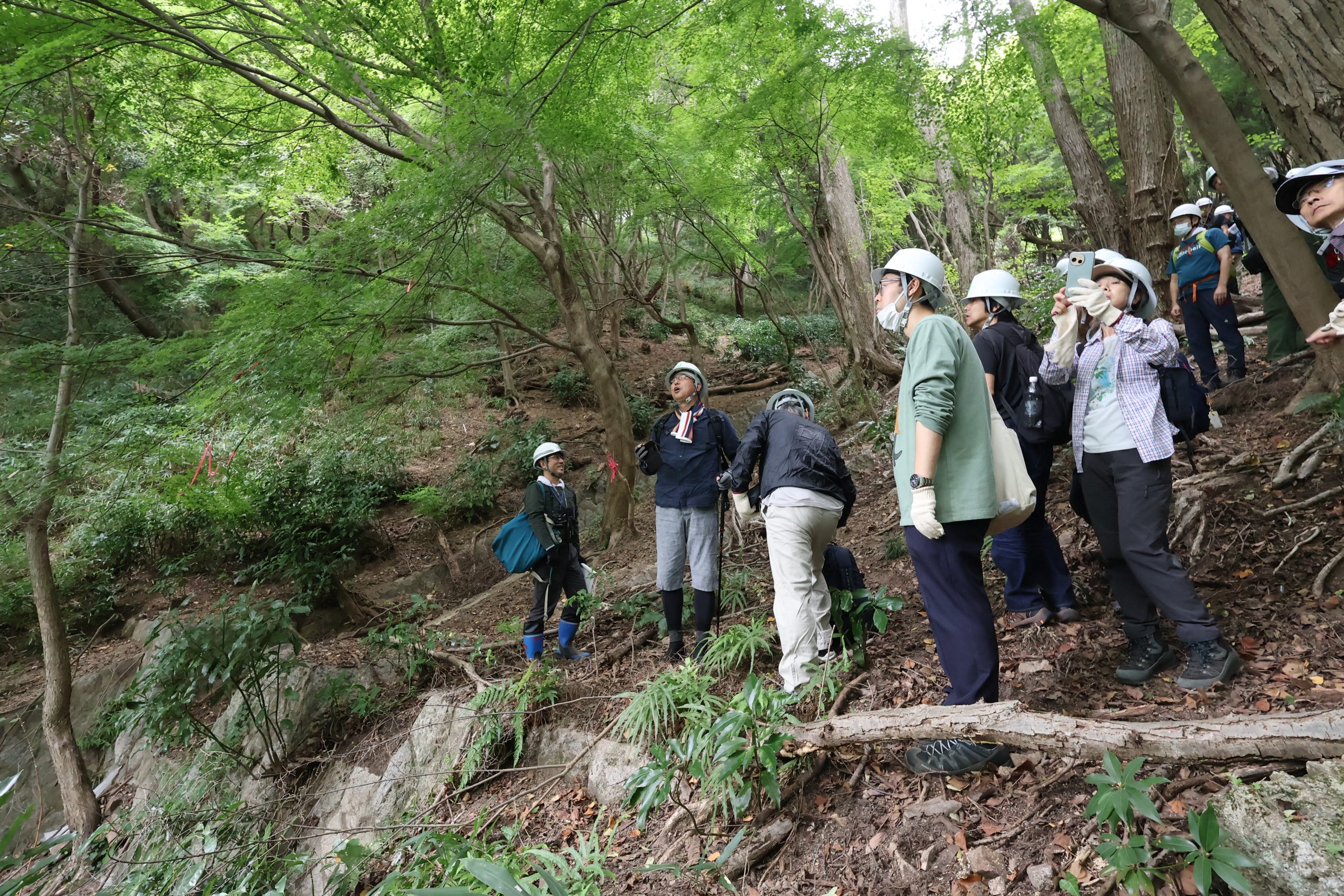 4班に分かれ、約3kmの周回コースを案内。明治時代の遺構や治山施設の設置目的・効果を説明し、森林インストラクター兵庫の方々による植生観察会も実施しました。