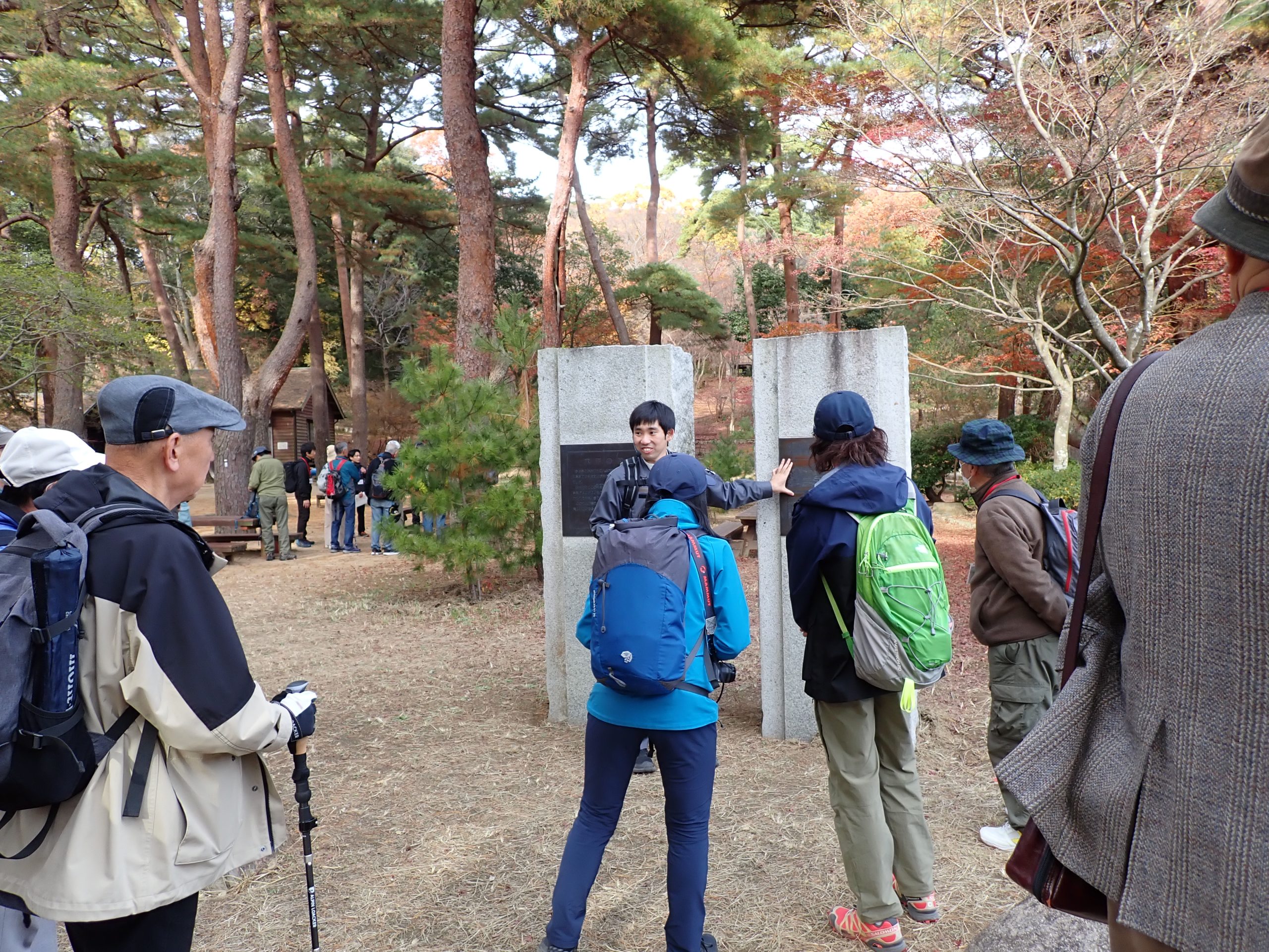 イロハモミジの森で治山遺構の当時の竣工記念碑の説明を受ける参加者